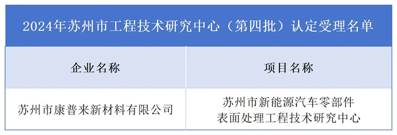 The Suzhou Science and Technology Bureau has announced the list of applicants accepted for the 2024 Suzhou Engineering Technology Research Center (fourth batch) certification. Suzhou Coplate New Materials Co., Ltd., located in Huangqiao Street, has been successfully selected.